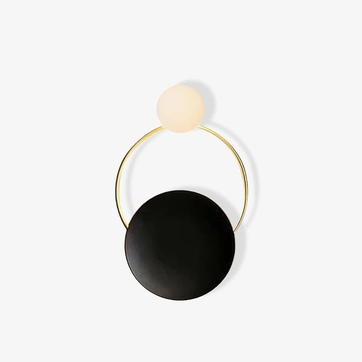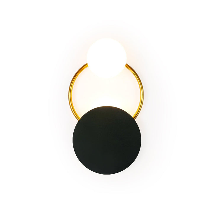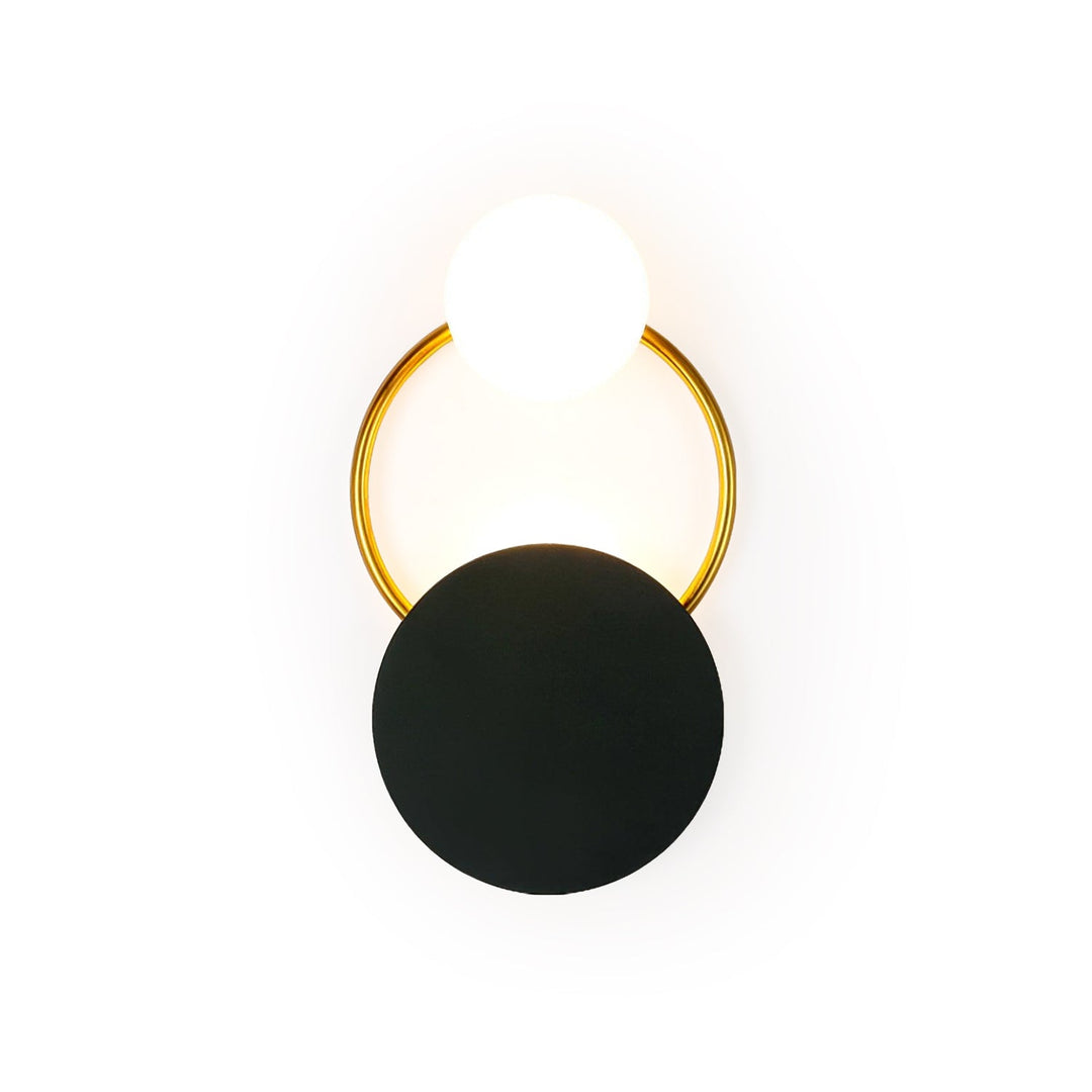 This unique Black Circular Rings Wall Lamp has an elegant and beautiful look and is perfect for creating a cozy atmosphere and accenting your walls. The Black Circular Rings Wall Lamp has a symmetrical design and consists of an white glass sphere, a gold ring and a black disc. as an accent light above your bedside table, but also suitable for many other environments.