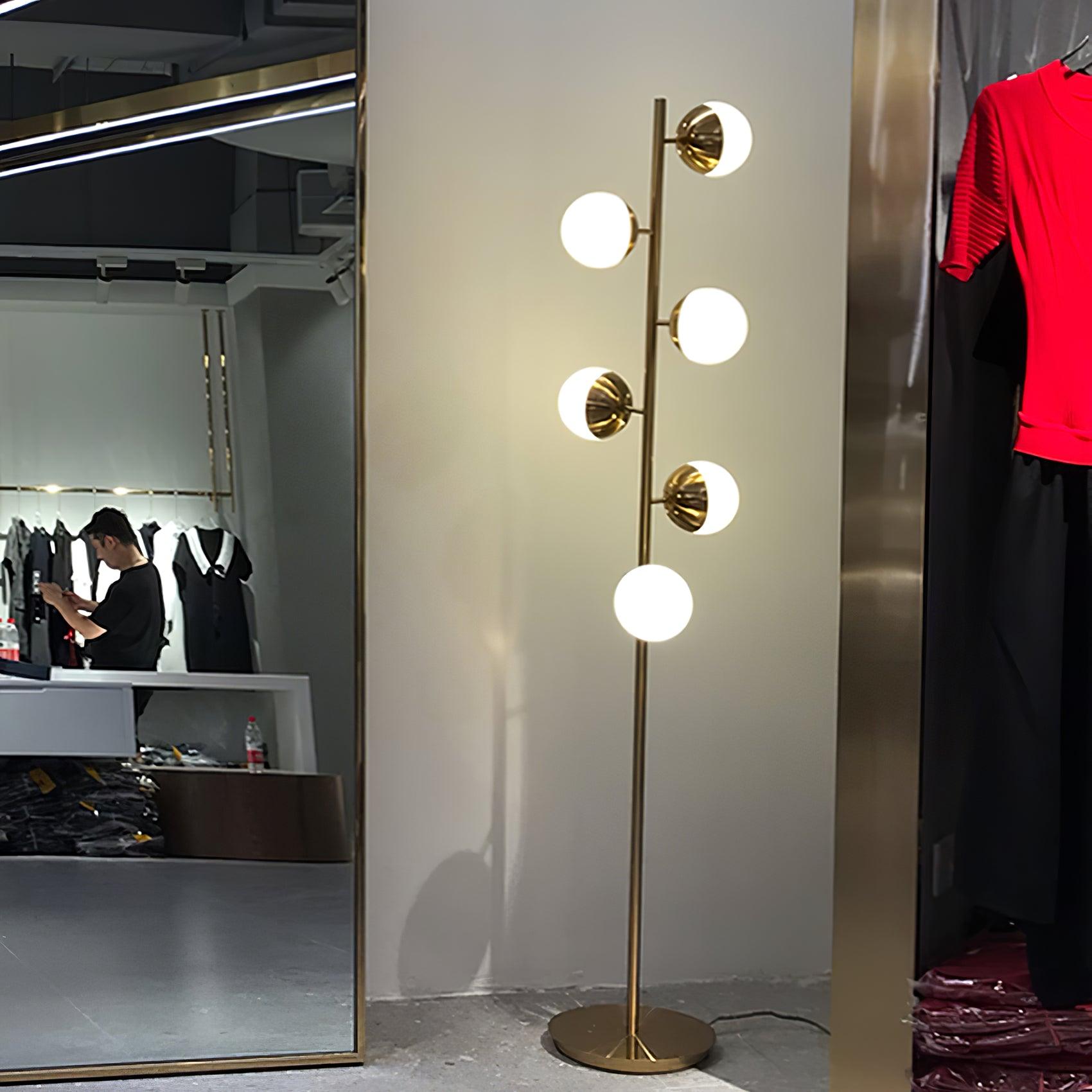 The Doppler LED Tree Lamp has mid-century modern inspiration. multiple white glass globe shades are scattered along an gold pole. A square golden round base serves as a decorative accent as well as a heavy weight to keep this lamp sturdy and safe.