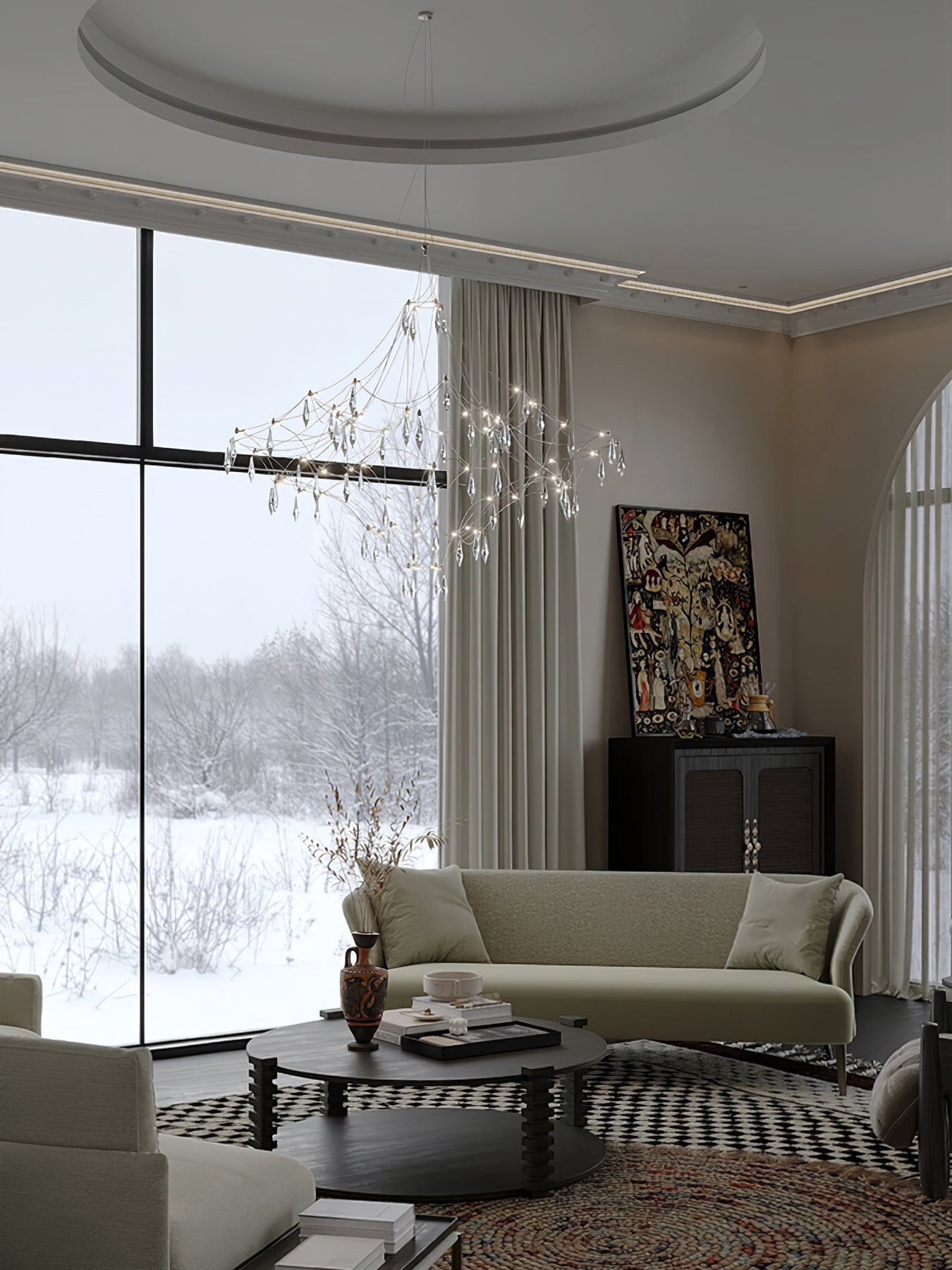 Chandeliers and Pendants: These are the focal points of the living room, especially in rooms with higher ceilings. To size appropriately, use the room dimension formula and ensure the fixture is in scale with the room’s layout. A general rule is to ensure there is at least 7 feet of clearance between the fixture and the floor.