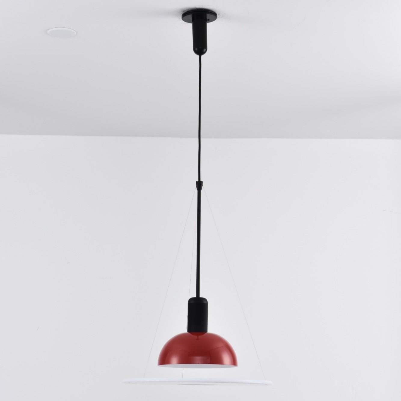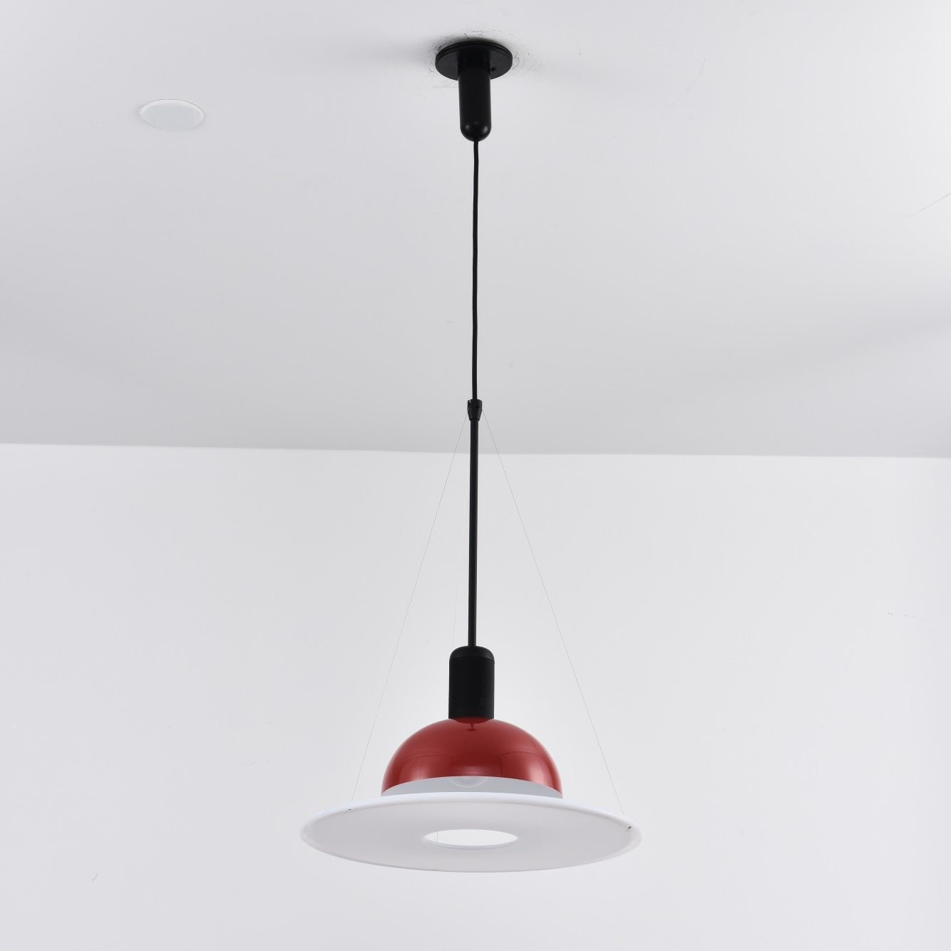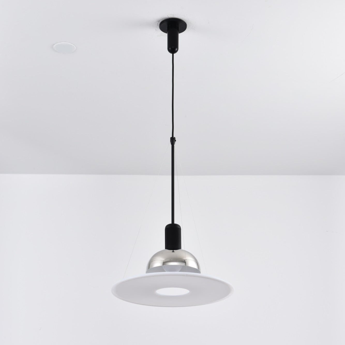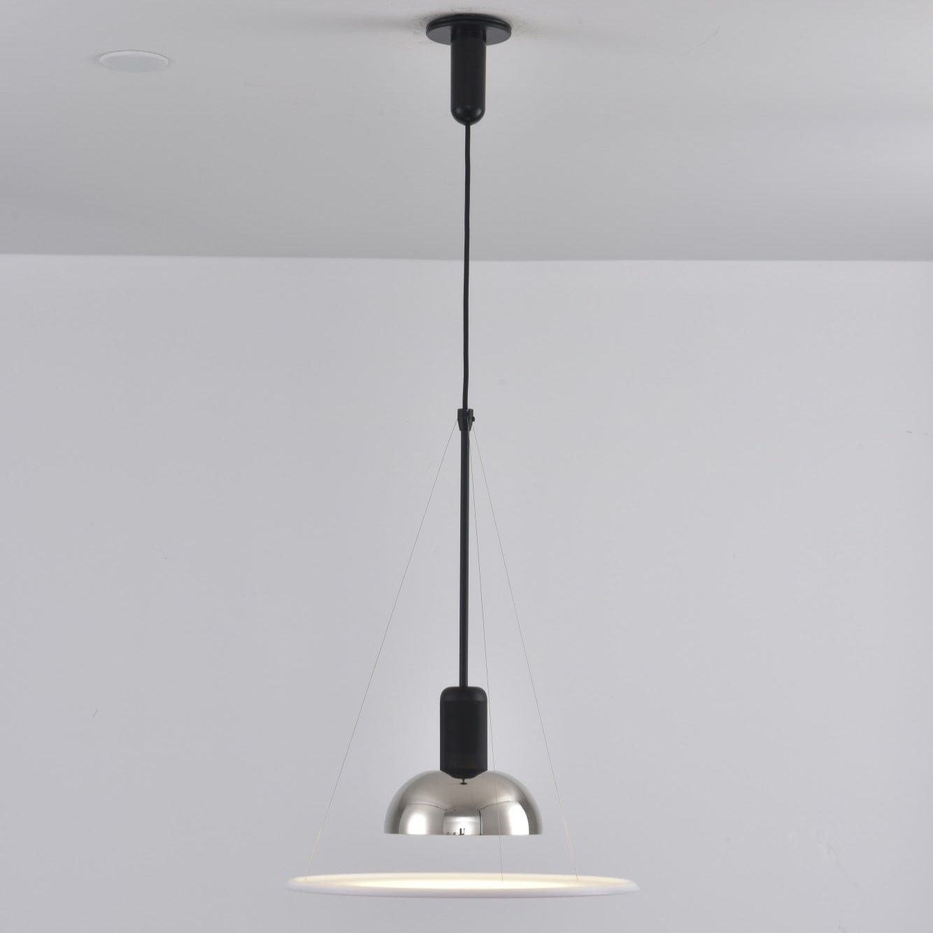 Flying Saucer Pendant Light offers a blend of direct, diffused, and reflected illumination. The light features an opaline polymethylmethacrylate (PMMA) diffuser plate, crafted through injection molding and elegantly suspended by three slender steel cables. Its polished, nickel-plated reflector, made from zapon-varnished stamped sheet metal, boasts a sleek gloss-white interior. Completing the design is a black-painted, injection-molded ABS ceiling fitting and rose.