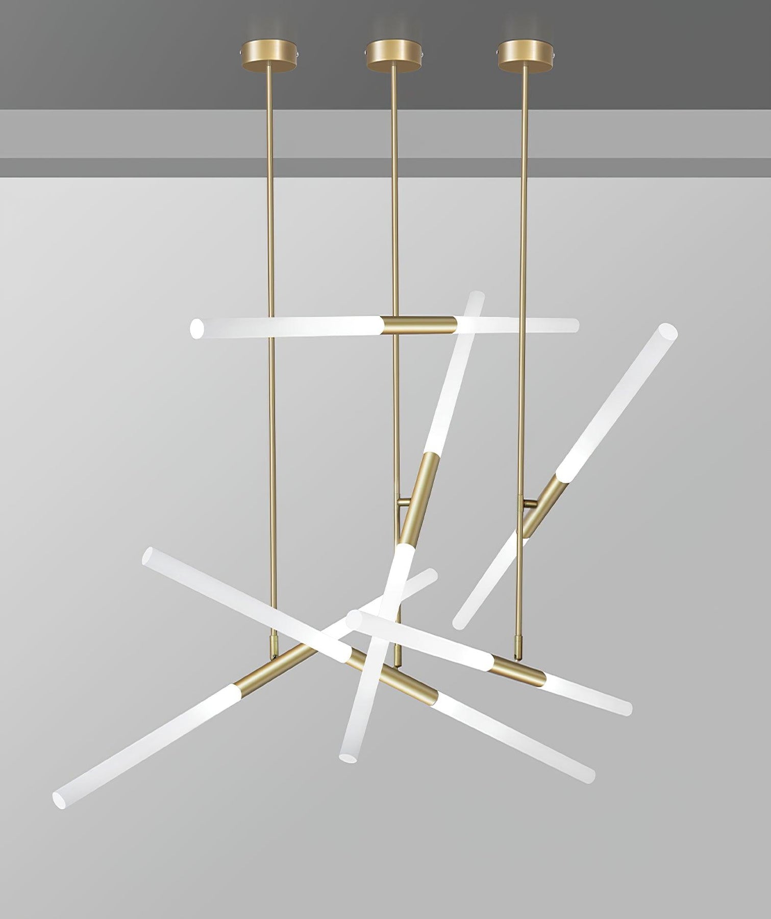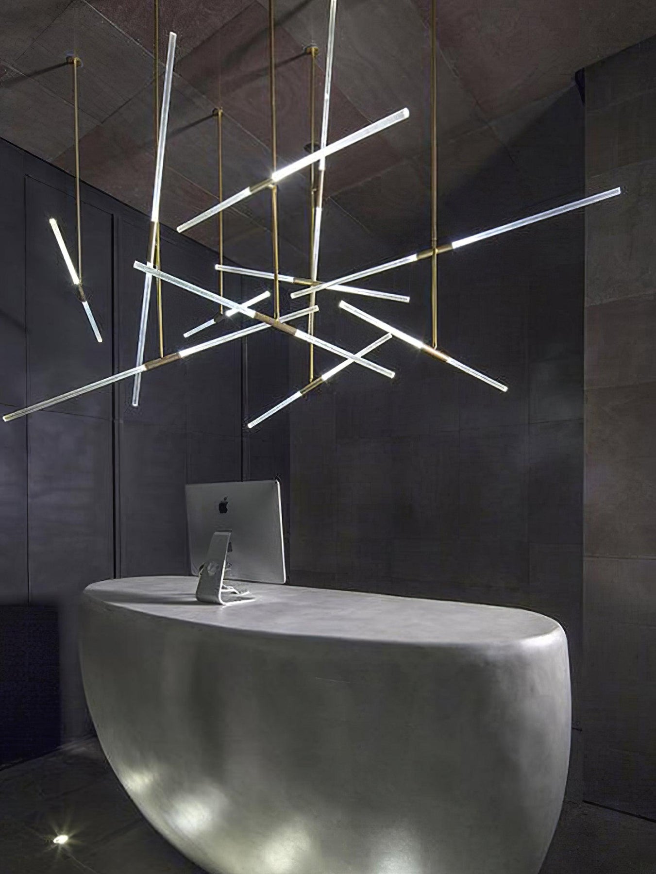The Hash LED Linear Suspension will bring some artistic asymmetry to your lighting scheme. Random placement of aluminum tubes with exposed bulbs at each end form this fixture. One rigid stem per light and a metal ceiling canopy support the structure.