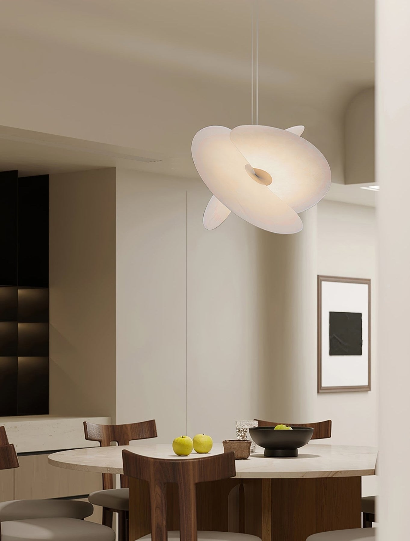 Inspired by the ethereal beauty of organic forms gracefully floating in space, the Levante Pendant Lamp evokes a sense of weightlessness and tranquility. Its name alludes to lightness and wind, paying homage to Eastern aesthetics and enhancing its allure. Expertly designed with three intersecting fans, it diffuses light and exudes the delicate beauty of rice paper.