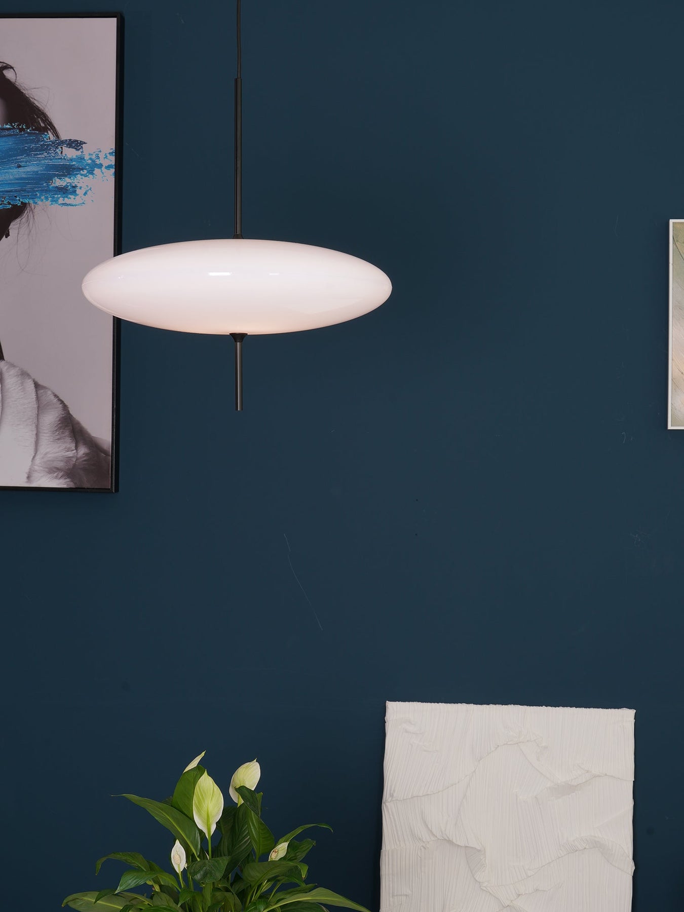 Model 2065 consists of a diffuser made of two joined opalescent saucers, suspended from the ceiling with a black-painted aluminium canopy. The simplicity of designer elliptical design and the lightness of the materials make for a seemingly weightless luminaire.