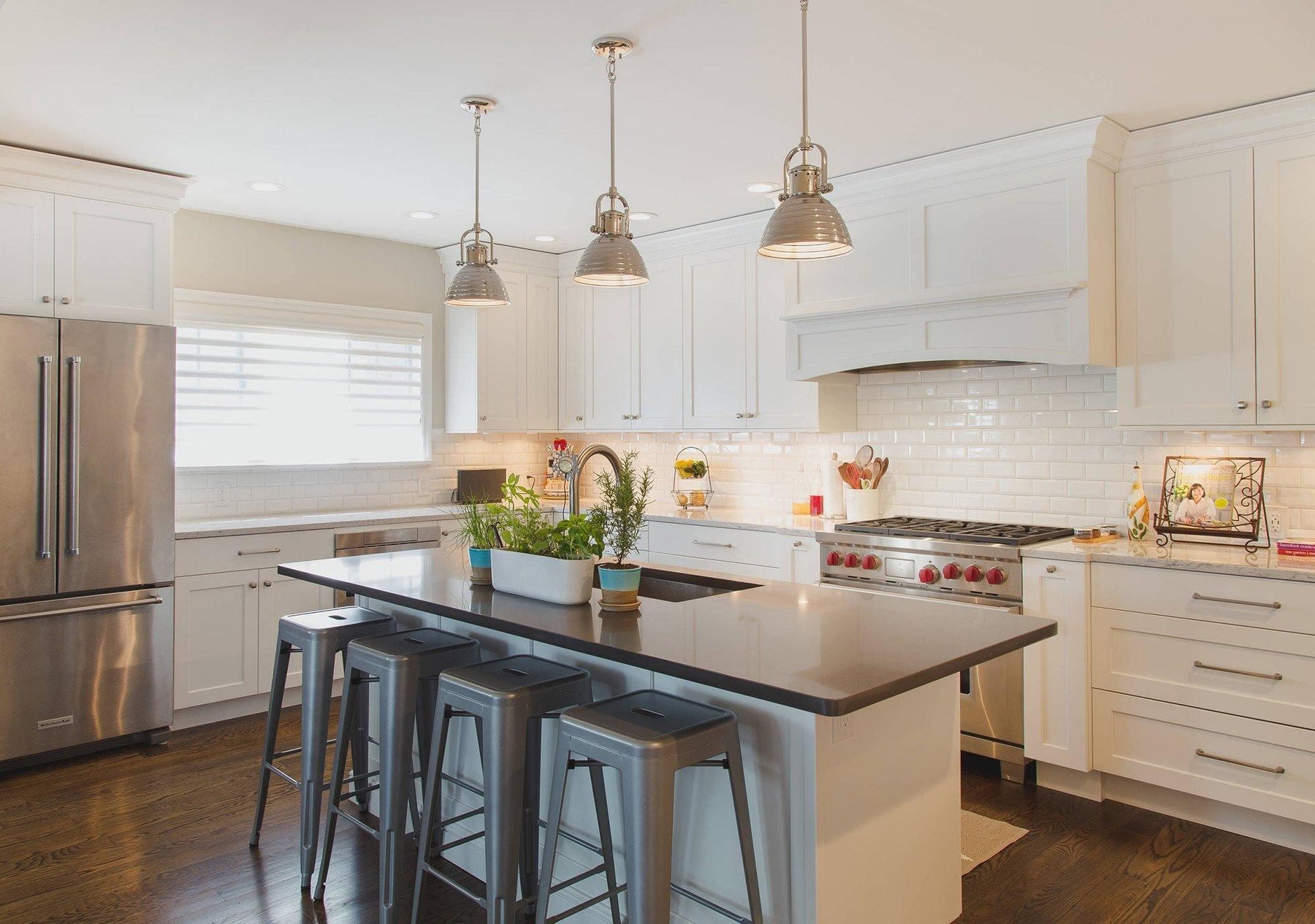 • Pendants Over Island: These provide crucial task lighting for food prep and should hang 32-36 inches above the surface. Make sure that each pendant is about 1/4 the length of the island to provide sufficient coverage without overwhelming the space.