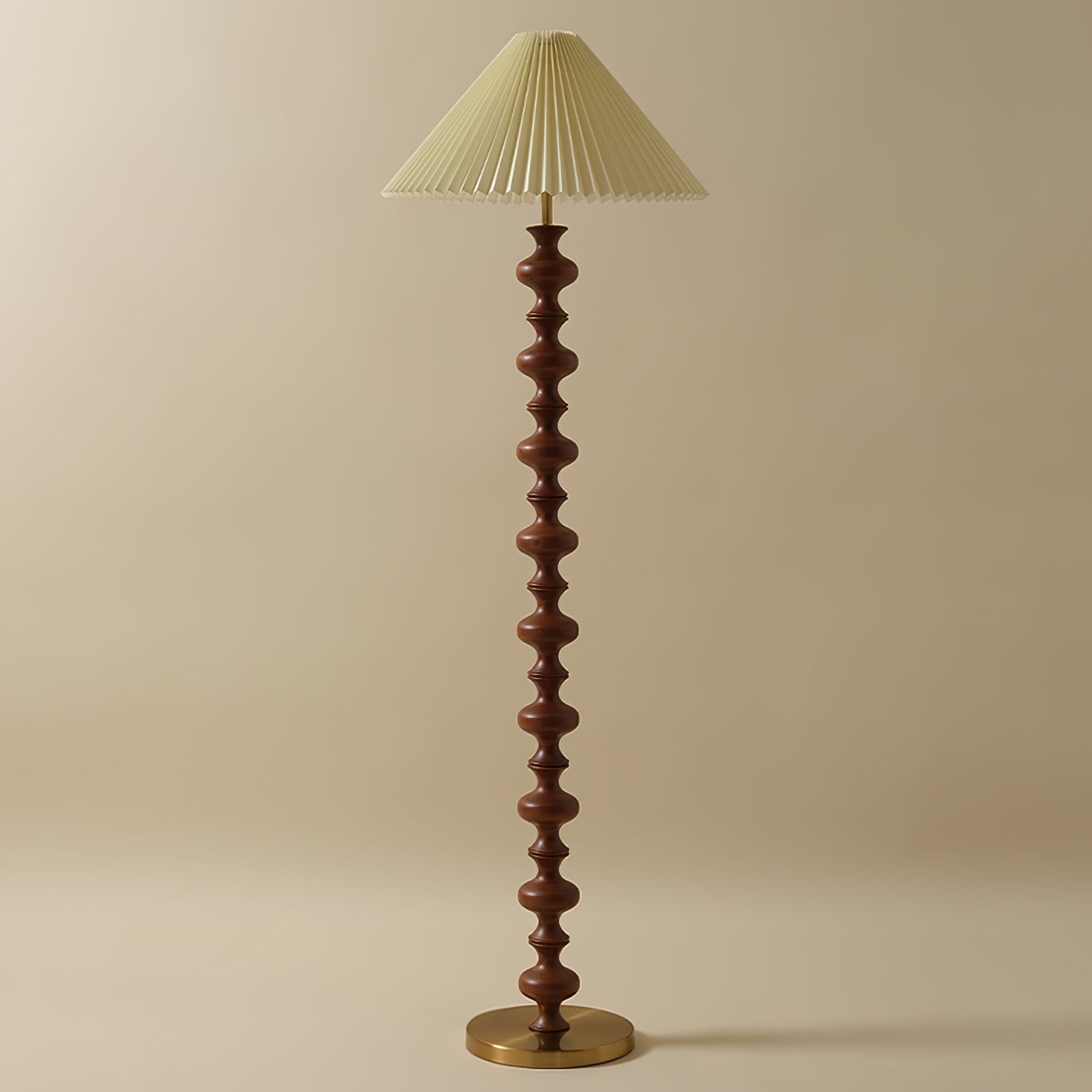 This floor lamp features a strikingly artistic wooden base with a rhythmic, undulating design that adds a sense of movement to any space. Paired with a pleated shade, it blends mid-century charm with modern sophistication, making it a statement piece for contemporary interiors.