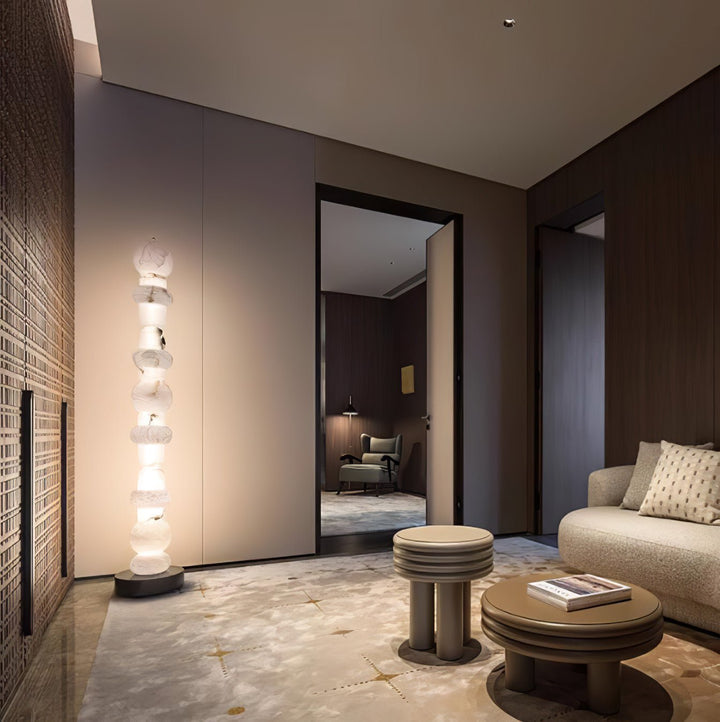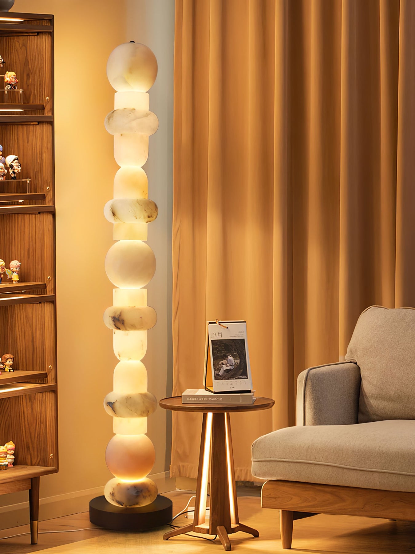 Introducing the Spanish Alabaster Lamp, a stunning sculptural masterpiece that seamlessly merges the raw beauty of alabaster with the elegant verticality of totemic designs. This floor lamp features a series of meticulously hand-carved alabaster stones, each uniquely showcasing its own translucency and natural vein patterns. Arranged in a harmonious sequence, the stones evoke the timeless allure of ancient totems, offering a sense of balance and continuity.