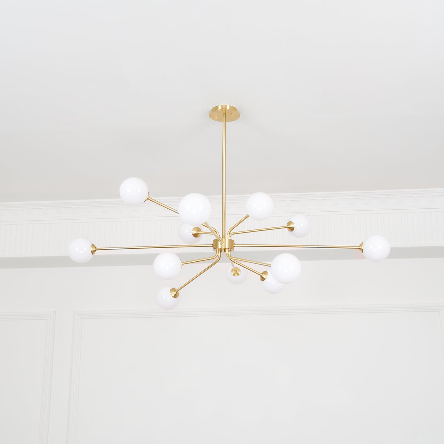 Elegance, style, sophistication. The Solaire Arm Chandelier will get all the compliments no matter where you hang it. The smooth White Glass globes, refined brass arms and delicate structure make for a pretty beautiful light.