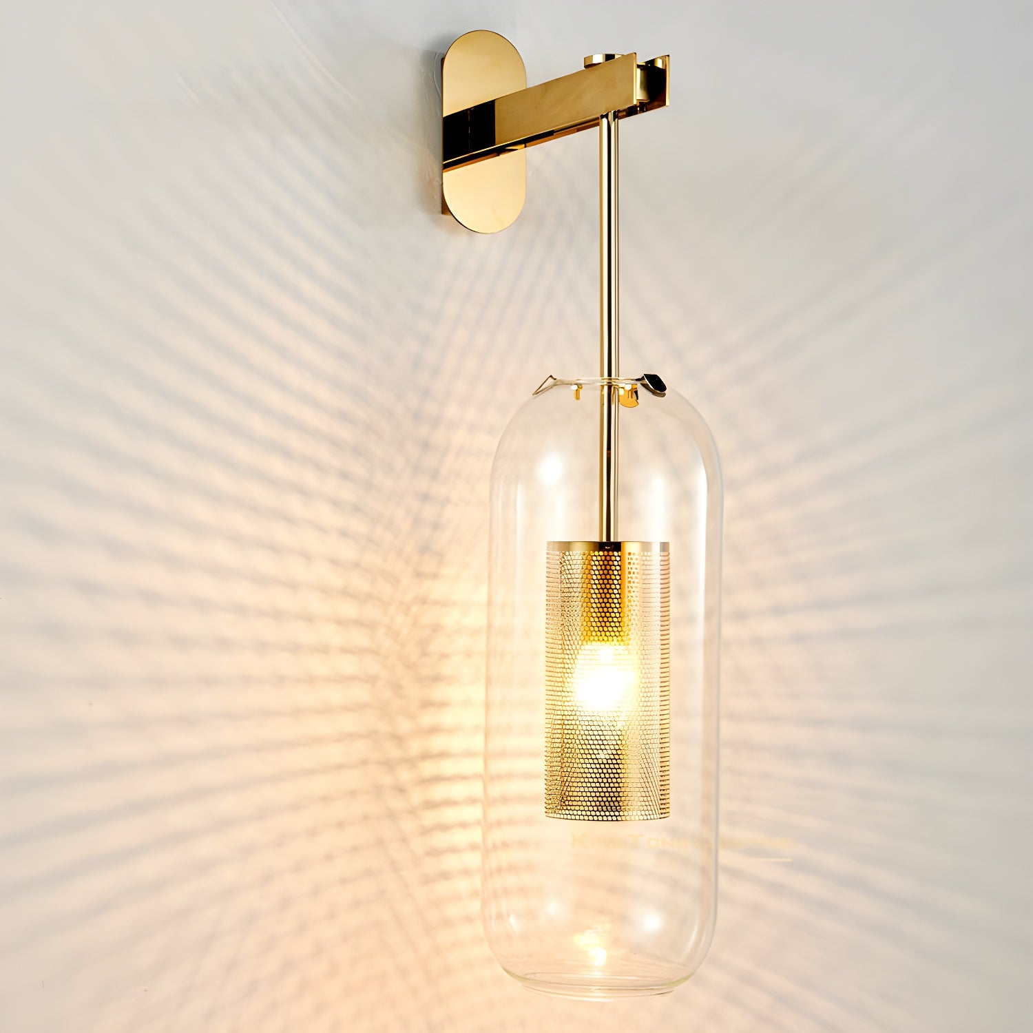 The majestic Vadim wall lamp sports a generous glass body which contrasts with its fine steel rod. Suspended in the air, the perforated cage emits a soft light and projects graphics reflections on the walls.