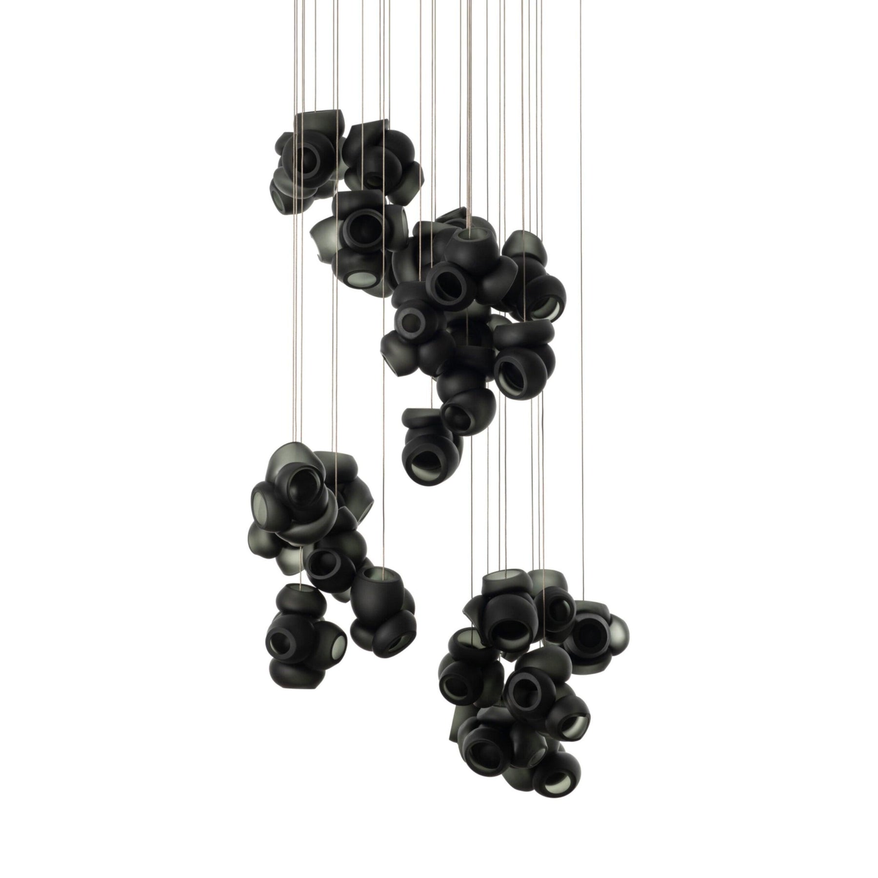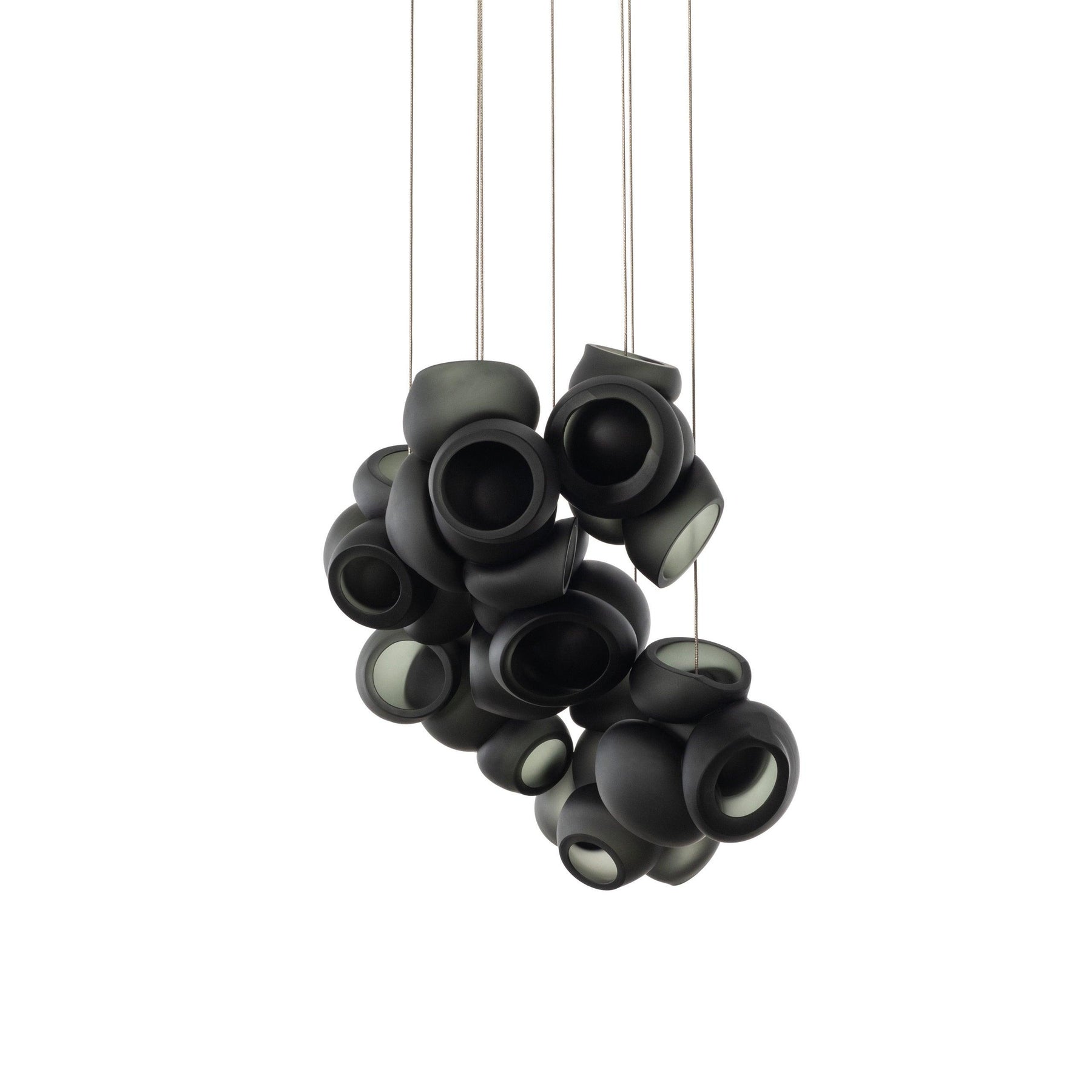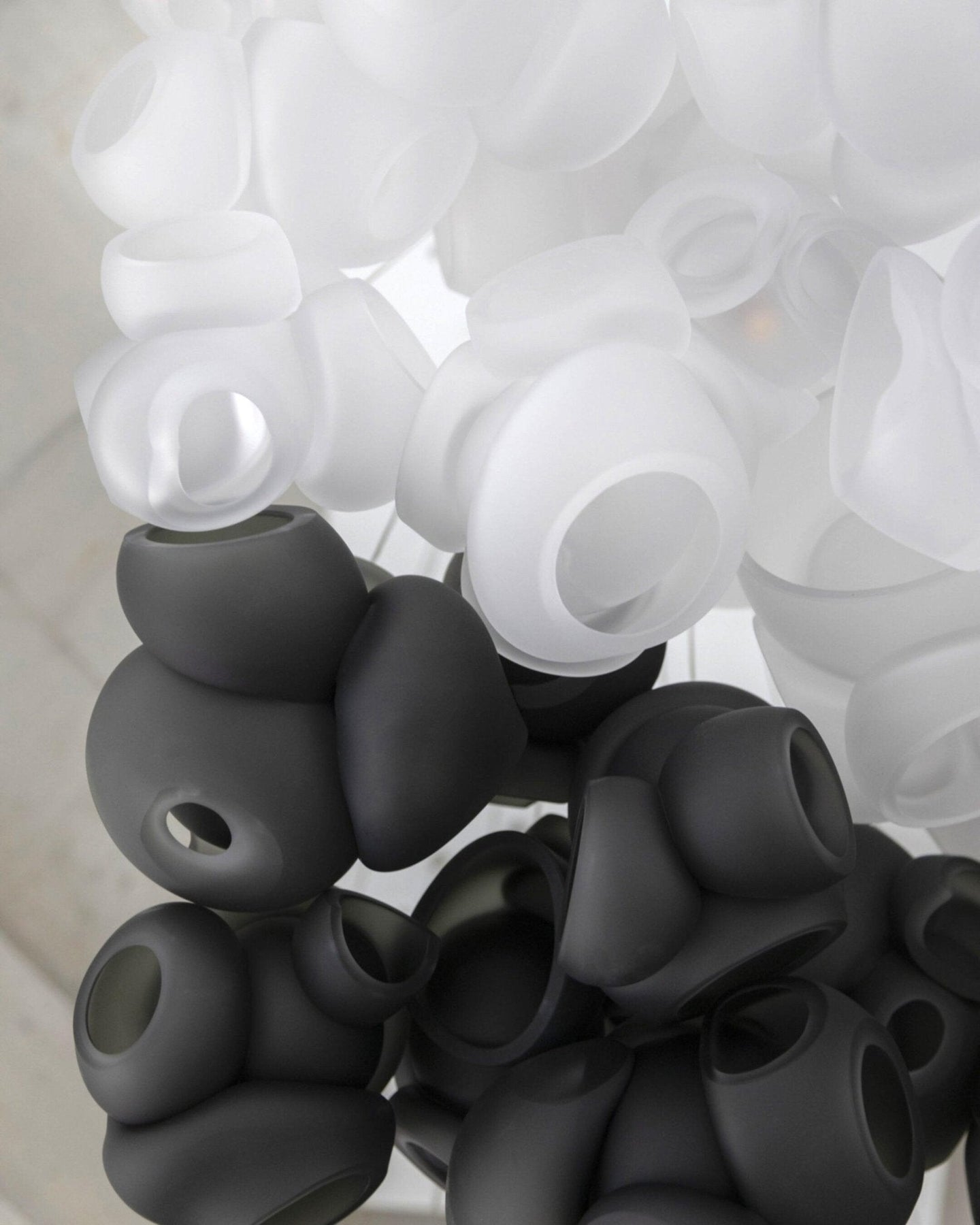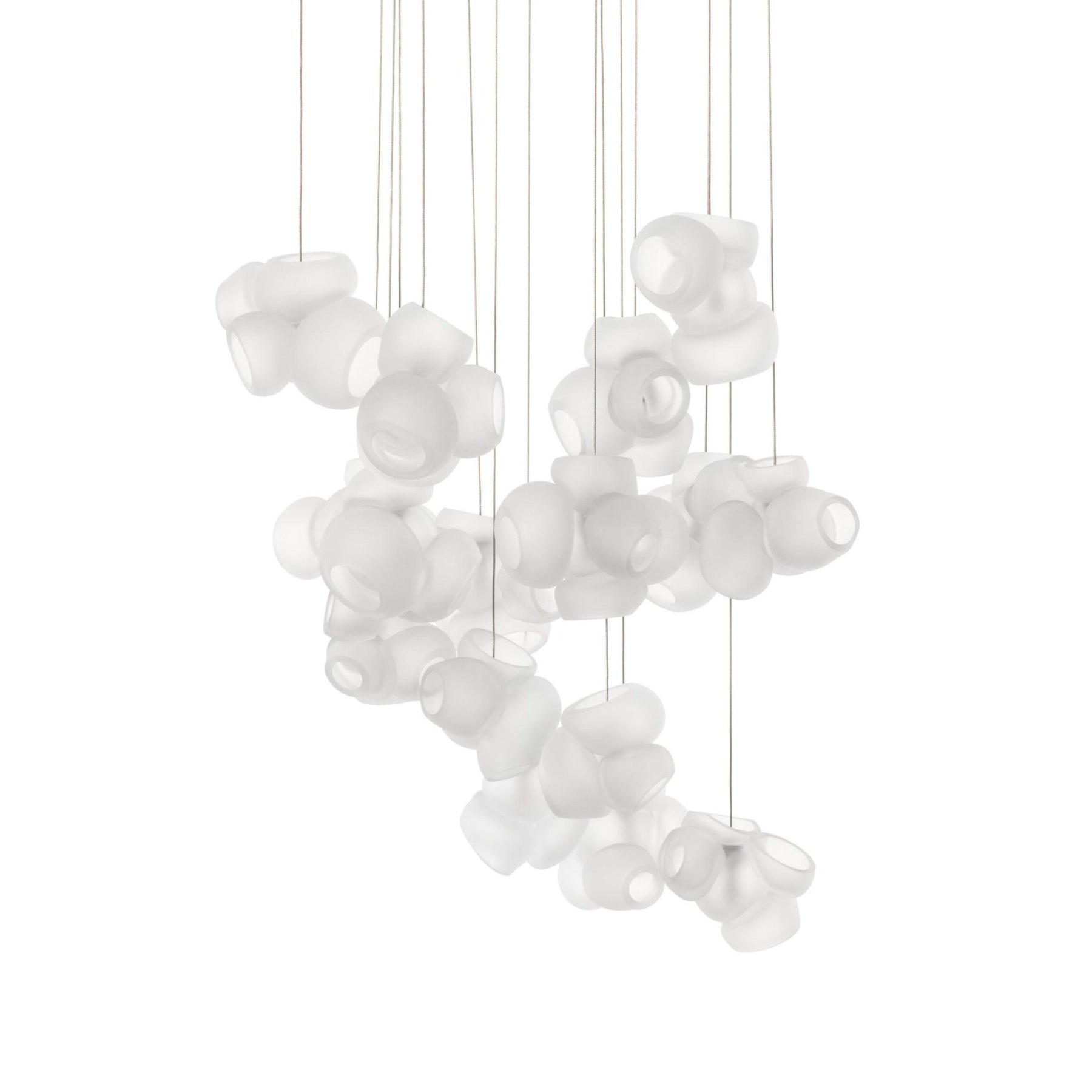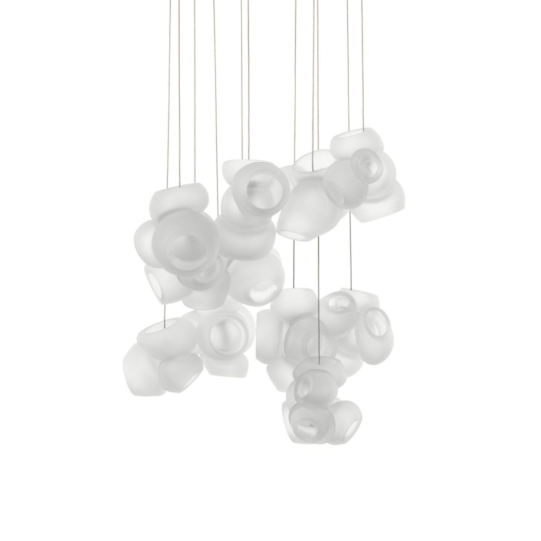 The modular Bubbles Cluster Pendant Light is formed when multiple glassblowers methodically produce glass bubbles, then instantly push the malleable spheres into an interlocking cluster. The light fixture remains suspended in the air by being connected to the ceiling canopy. This decorative piece brings a modern, handcrafted aesthetic to your living space, livening up your design scheme.
