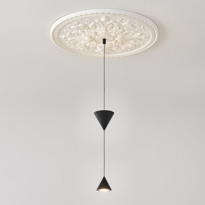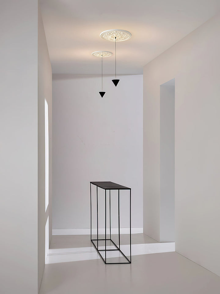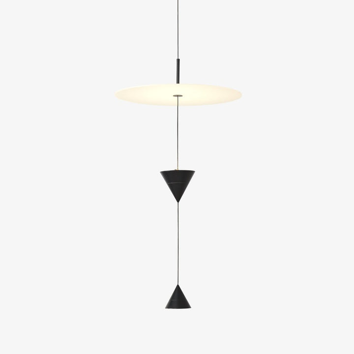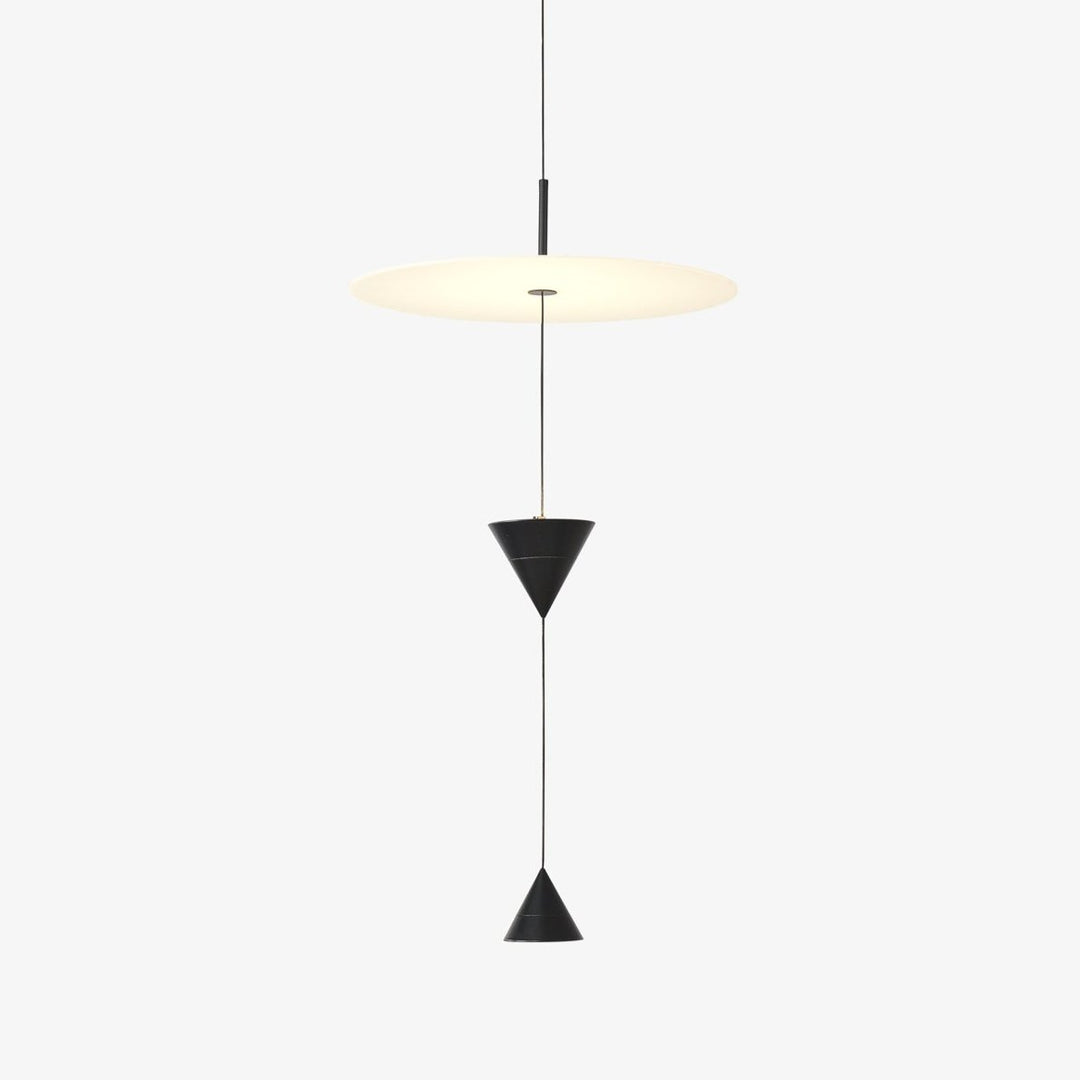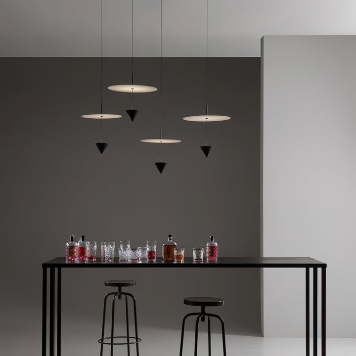 The Stralunata Pendant Lamp boasts a minimalist and elegant design, with a suspended circle and innovative weights and counterweights system. Its soft light, created by the inverted black aluminum cone reflecting off the white aluminum disc, adds a unique and sleek touch to any space. Experience the perfect combination of form and function with this pendant lamp.
