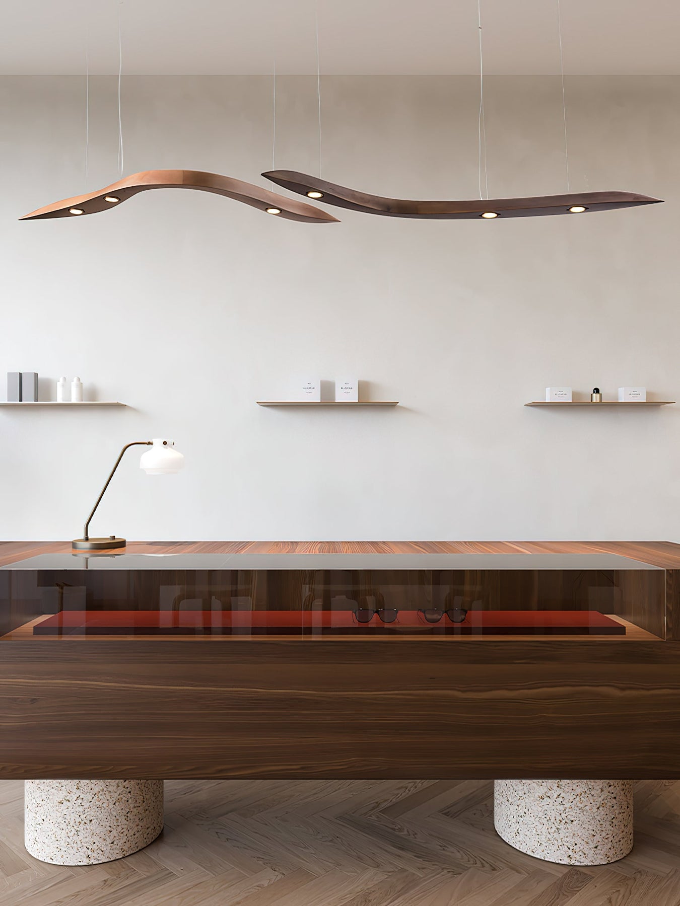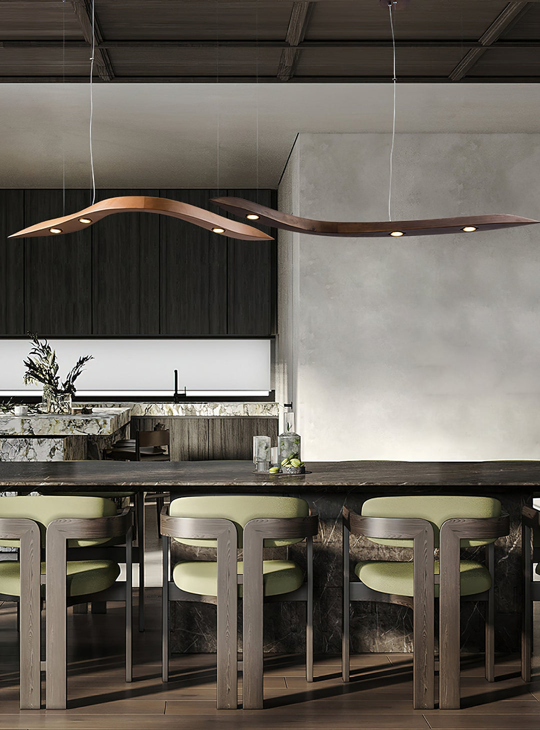 The Waveform Pendant Lamp is a testament to the elegance of natural flow and rhythm. Inspired by the gentle, undulating curves found in nature, this lamp embodies the fluidity of waves in its design. The sleek wooden form is meticulously crafted to create a sense of motion, as if captured in a moment of graceful movement. The warm tones of the wood and the modern curvature combine to offer both a timeless aesthetic and a striking contemporary centerpiece. Ideal for spaces seeking both sophistication and a touch of organic inspiration, the Waveform Pendant Lamp adds a dynamic yet serene presence to any room.