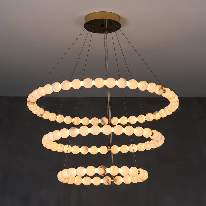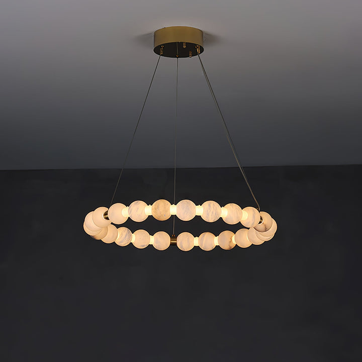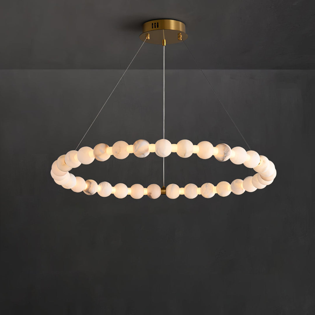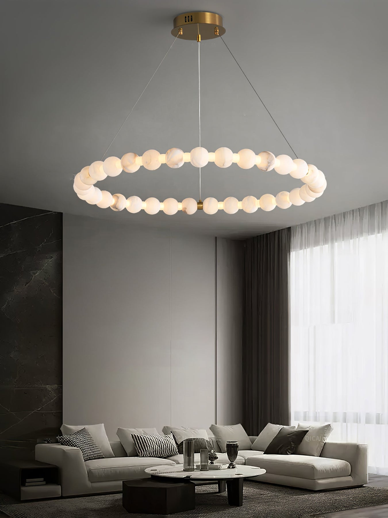 Elevate your space with celestial elegance through the Voviooli Orb Chandelier. Crafted from radiant alabaster spheres arranged in a perfect circular orbit, this chandelier creates a glowing halo of soft, diffused light that feels both luxurious and ethereal.