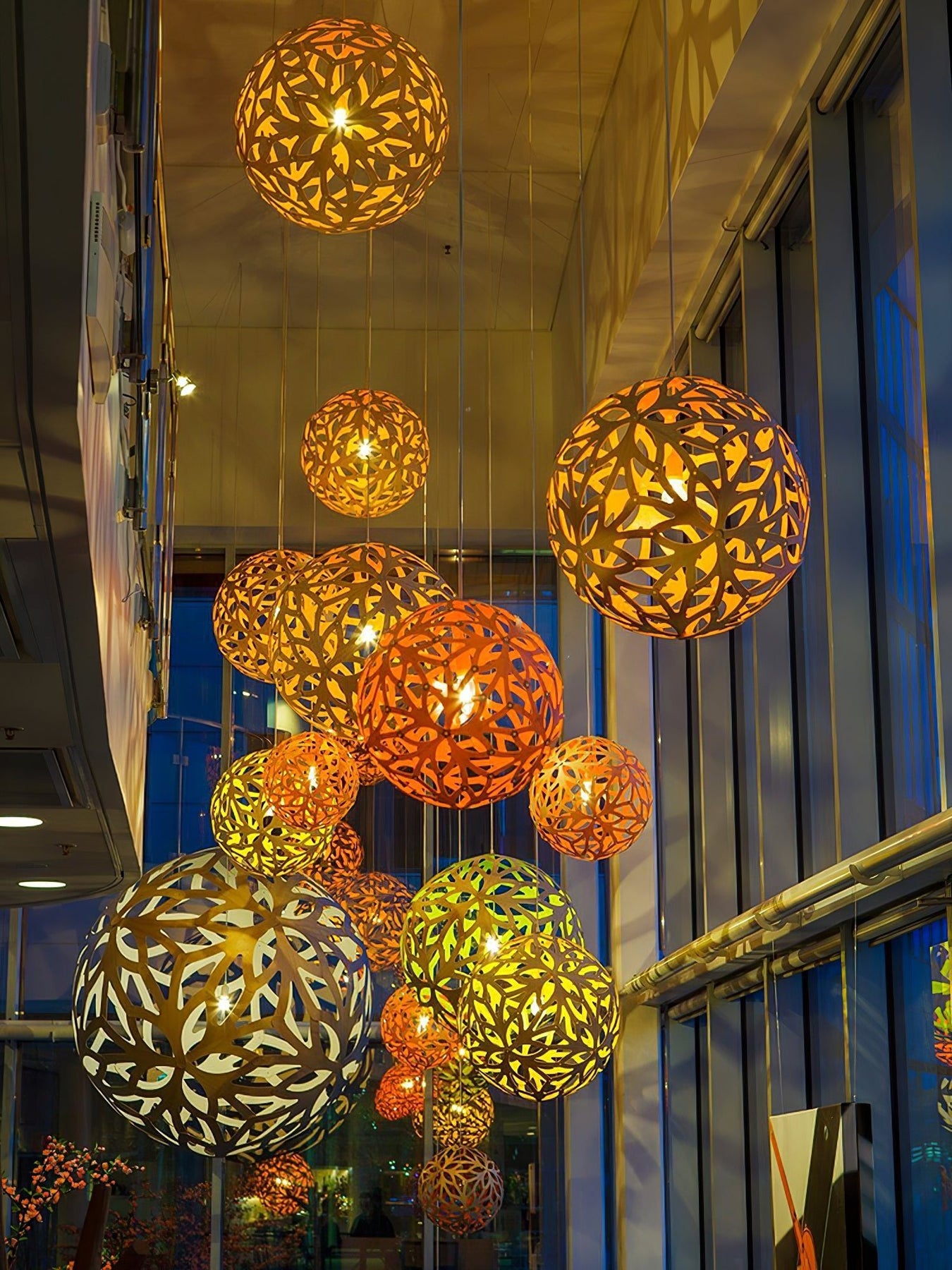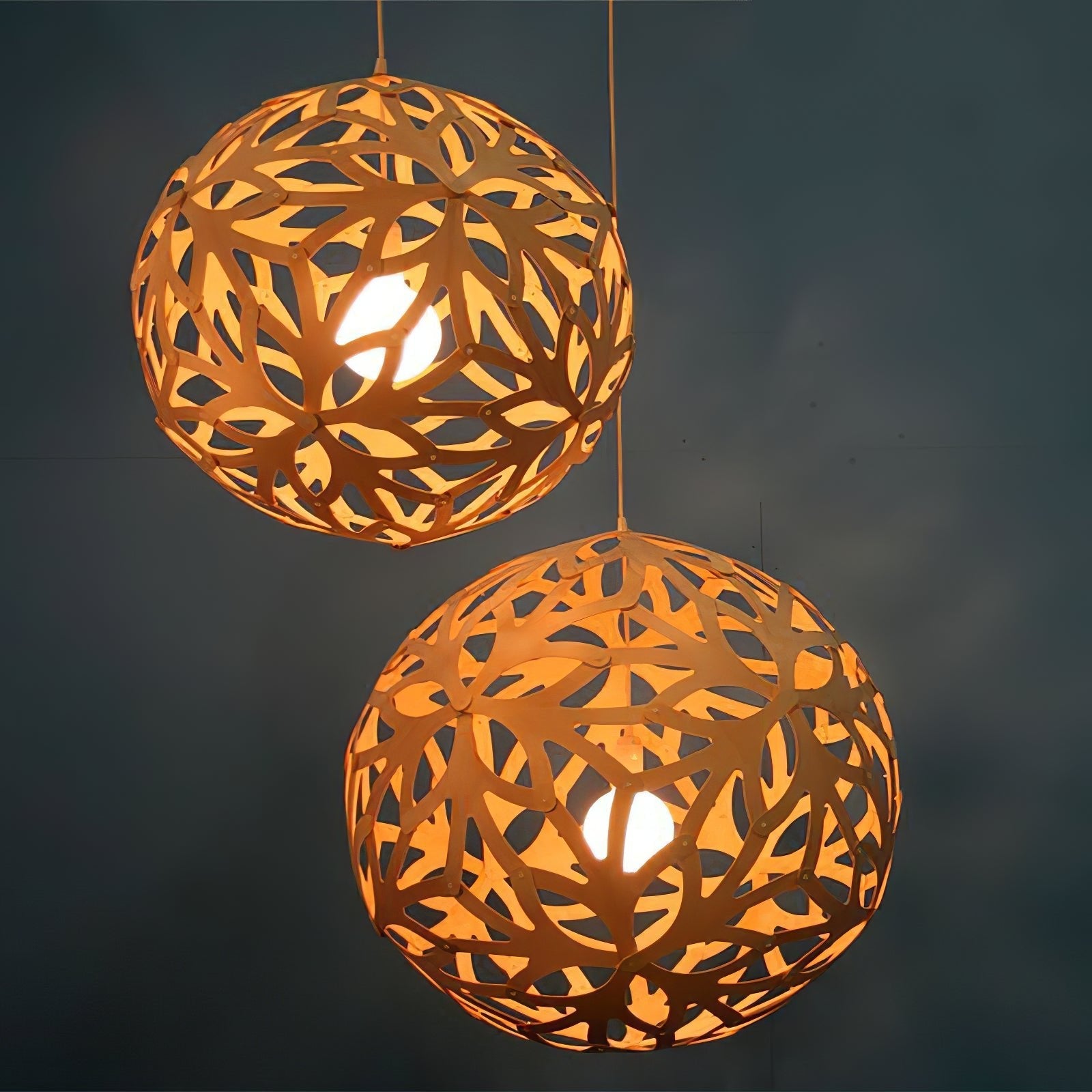 Ligno Pendant Lamp is a sculptural lighting piece inspired by the organic geometry of nature. Crafted from layered wood elements, its intricate openwork structure casts mesmerizing shadows while maintaining a sense of lightness. A harmonious blend of natural material and modern design, ideal for dining areas, creative spaces, or eco-conscious interiors.