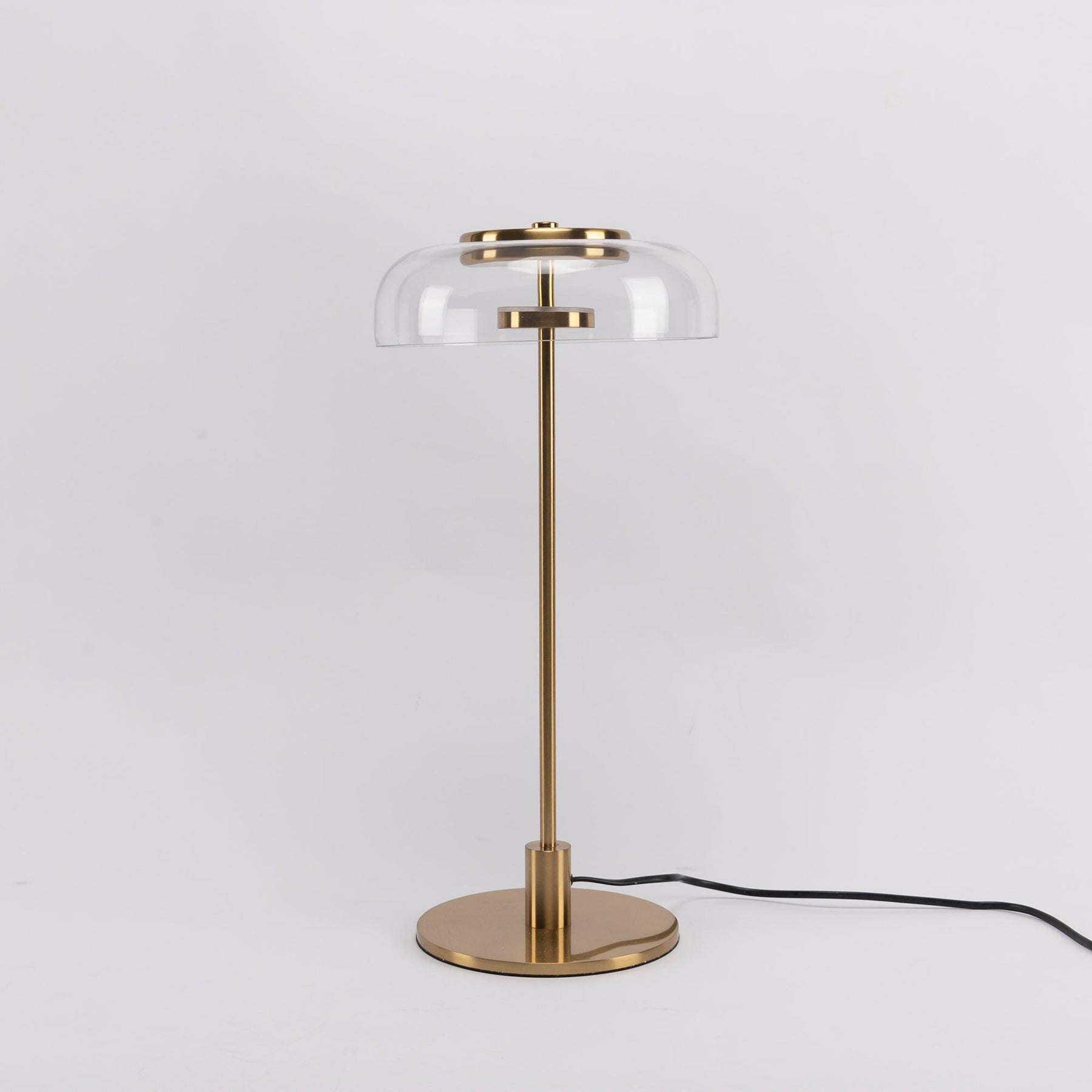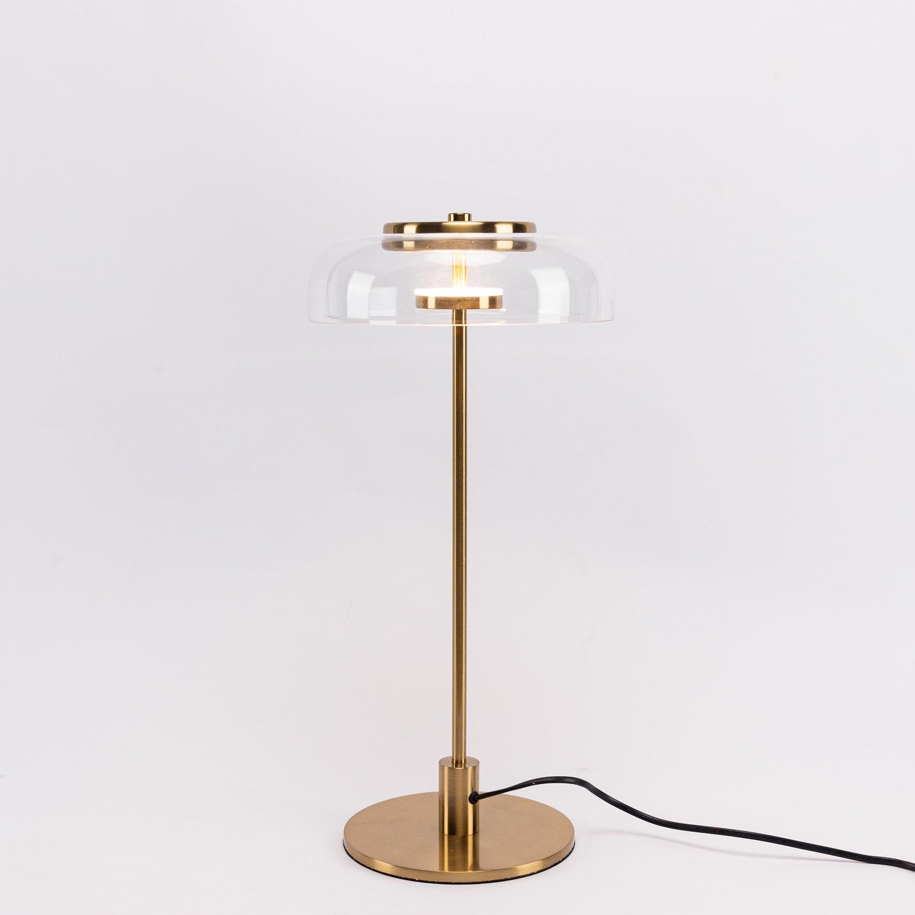 Illuminate your space with the Solara Table Lamp. The warm and soft light reflects onto the gold metal plate, creating a cozy atmosphere. The transparent glass shade adds a touch of elegance to your room. Transform your living space into a warm and inviting environment with this pendant lamp.