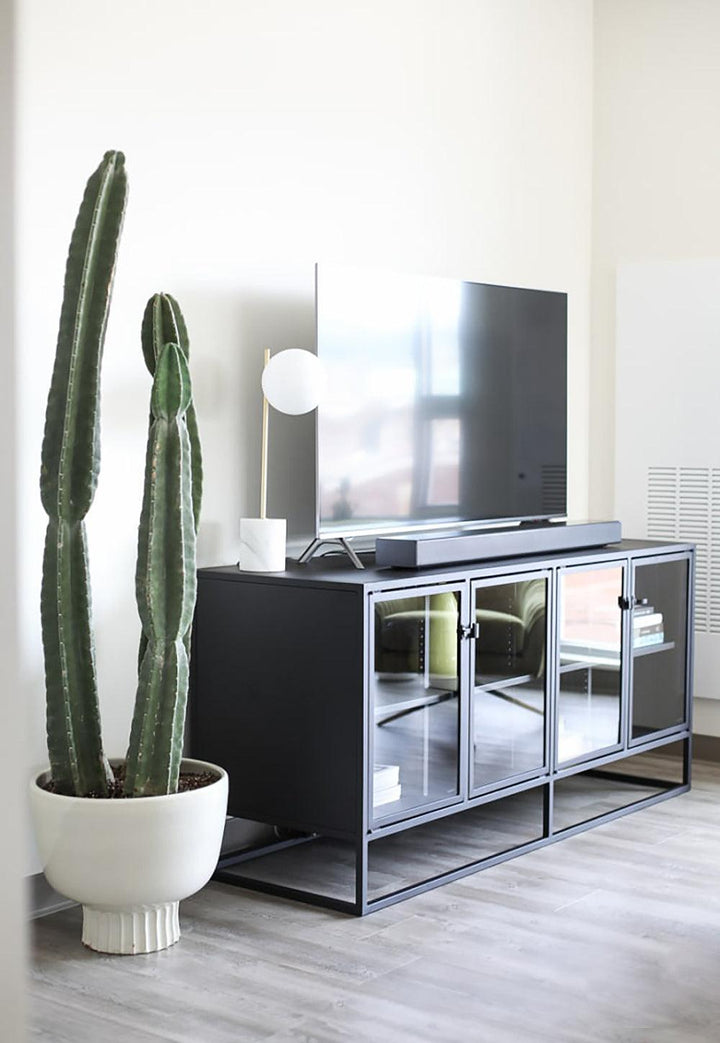 With its minimalist, balanced form, our Sphere and Stem Table Lamp's gleaming glass globe seems to float against its thin metal body for an elevated, modern look.
